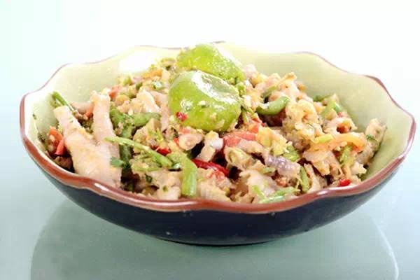 把雞腳放到石臼里搗碎,配上新鮮辣椒、西紅柿、檸檬、鹽、糖、味精、魚(yú)露等佐料,用石臼舂成糊狀。舂雞腳口味酸辣,配上小瓶啤酒,吃起來(lái)有滋有味。